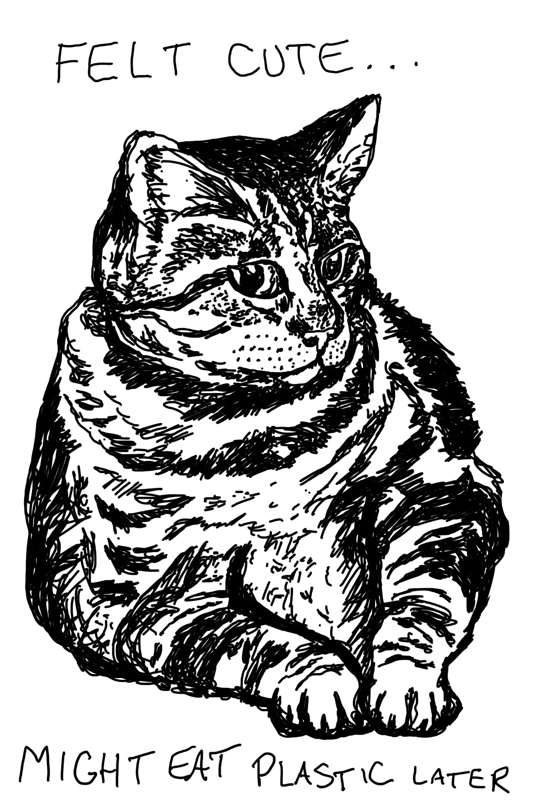 Digital drawing of my cat Sir Pounce. Pounce has a bad habit of chewing on the plastic wrap around packs of bottled beverages, but this also works as commentary on the microplastics we're all ingesting.