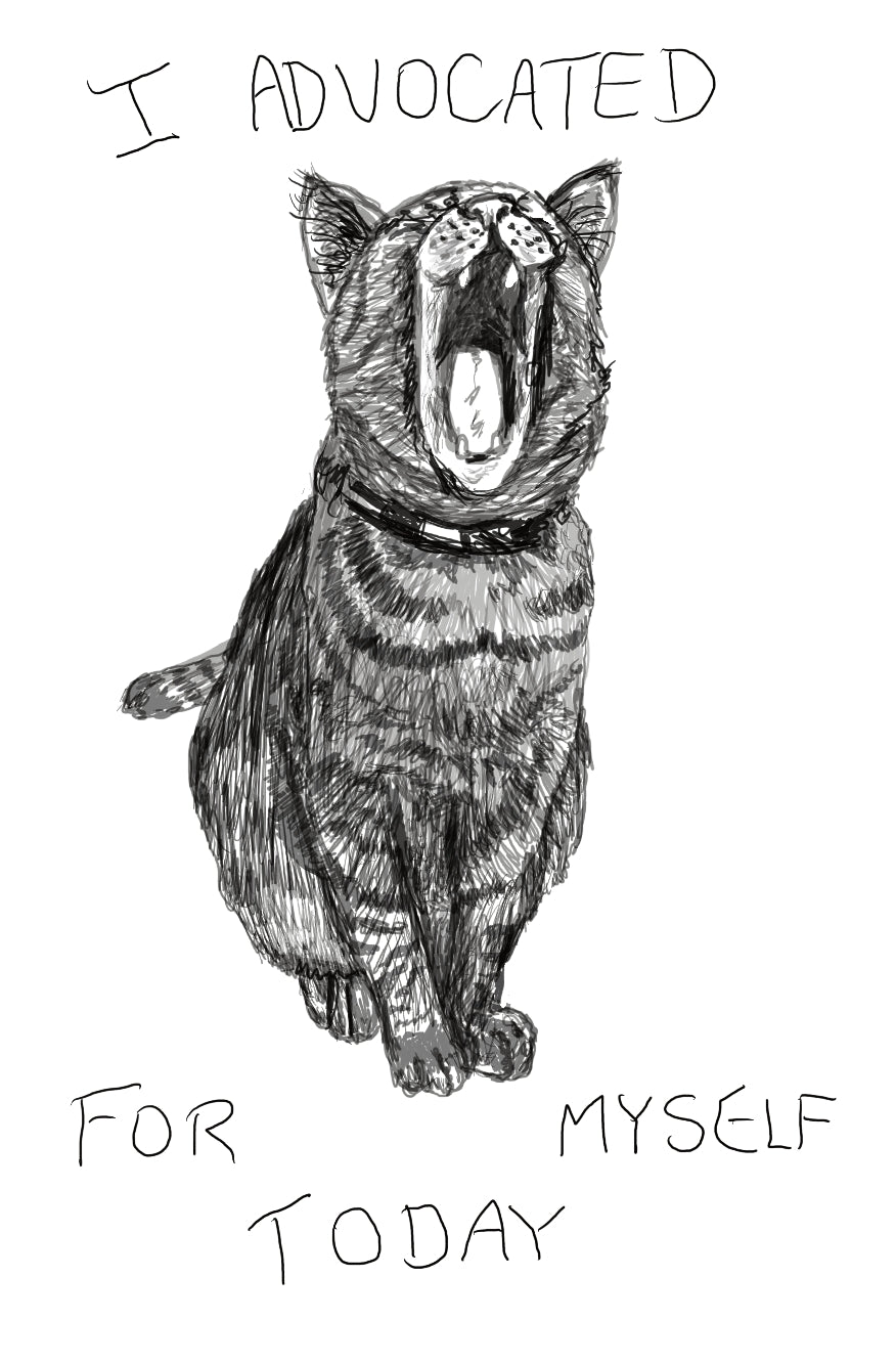 Digital drawing of my roommates' cat Grizzlor making a big yawn, but it looked like he was screaming. I came up with the idea after having to make phone calls for my prescription refill.